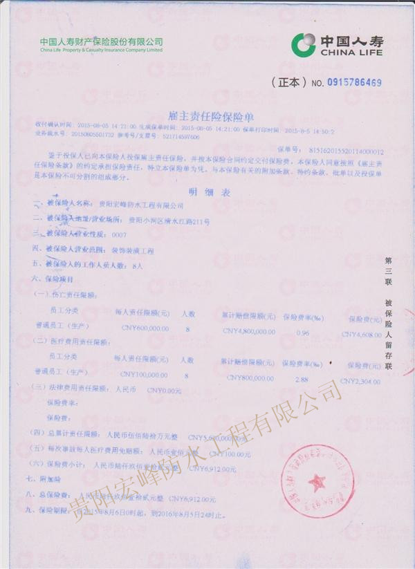 宏峰公司属国家防水防腐保温工程专业承包贰级资质企业,经贵州省住房和城乡建设厅考核合格